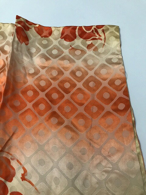商品説明:鹿の子の地紋地に朱のぼかし染めの施し半衿なし サイズ:裄64、身丈123、袖丈45、前幅25.5、後幅30.5cm 素材:正絹 状態:ランク3 クスミ シミ 黄変有 TPO:古布等 仕立て:手縫い バチ衿