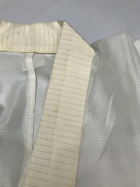 商品説明:さらりとした白絽の夏襦袢半衿付き サイズ:裄59、身丈117、袖丈45、前幅27、後幅28.5cm 素材:化繊 状態:ランク3 クスミ シミ有 TPO:普段後から礼装 仕立て:手縫い バチ衿