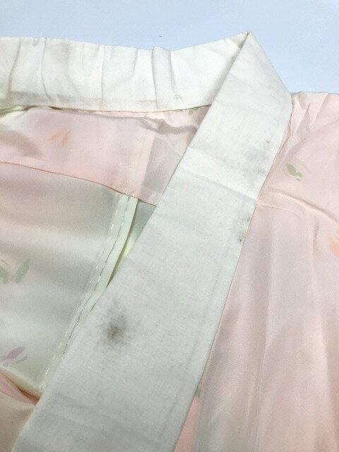 商品説明:しなやかなピンクぼかし地に蝶模様の染め成し 無双袖につき袷の扱い 半衿なし サイズ:裄67.5、身丈129、袖丈49、前幅27、後幅31.5cm 素材:化繊 状態:ランク3 クスミ 黄変 シミ有 TPO:普段着等 仕立て:手縫い バチ衿