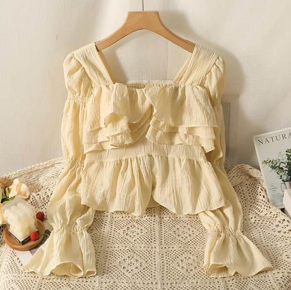 胸元のふわふわとしたフリルとボリューム感のある袖が女性らしさを引き立てます。