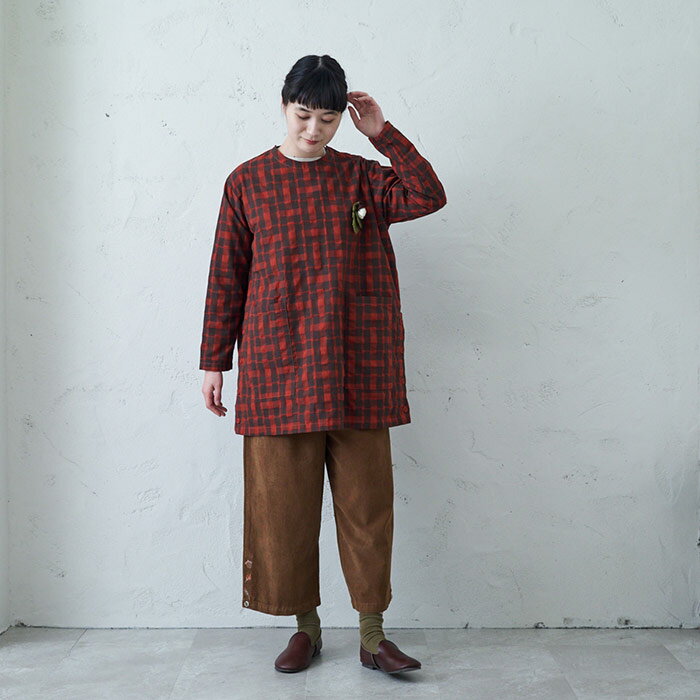 ・裾サイドのスリットは、お好みでボタンを開けると ボリュームのあるパンツやスカートにも合わせやすいです! ・かぎ編みのどんぐりブローチ付き ・ポケット付き ぜひ、おためしくださいませ。