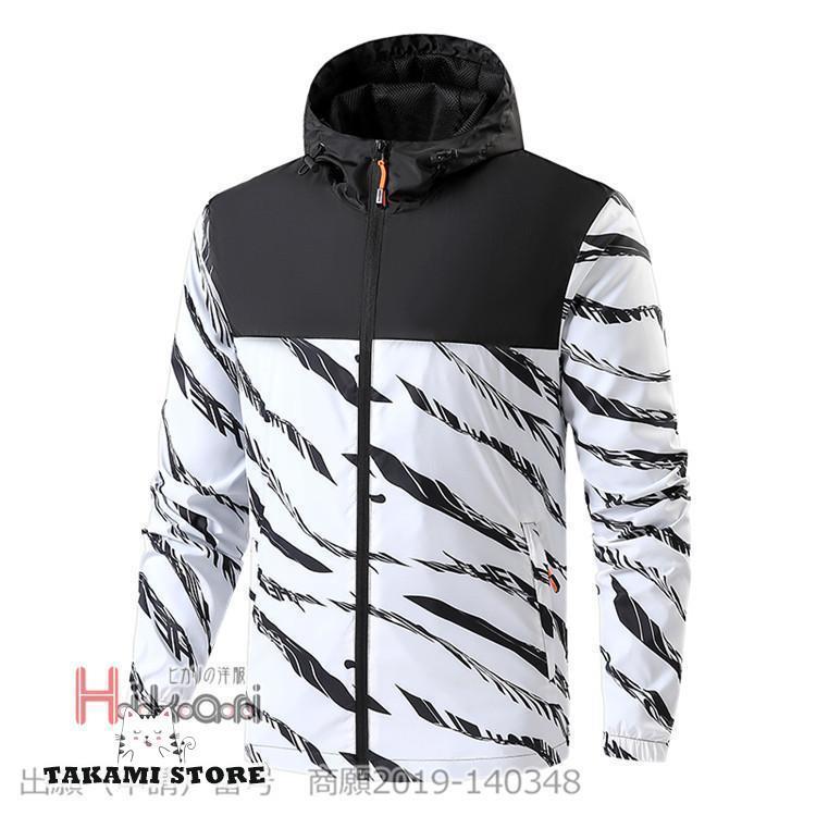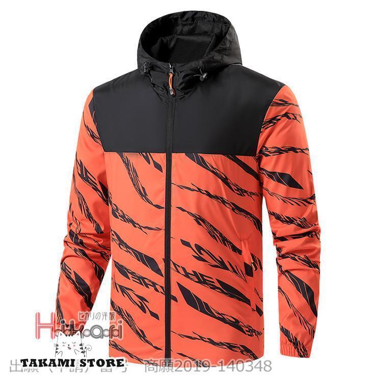 マウンテンパーカー メンズ 春 ウインドブレーカー 切り替え アウトドア ジャケット 薄手 長袖 ジップアップ フード付き ゼブラ柄色 オレンジ 白 黒サイズ M L XL 2XL 3XL 4XL素材:ポリエステル