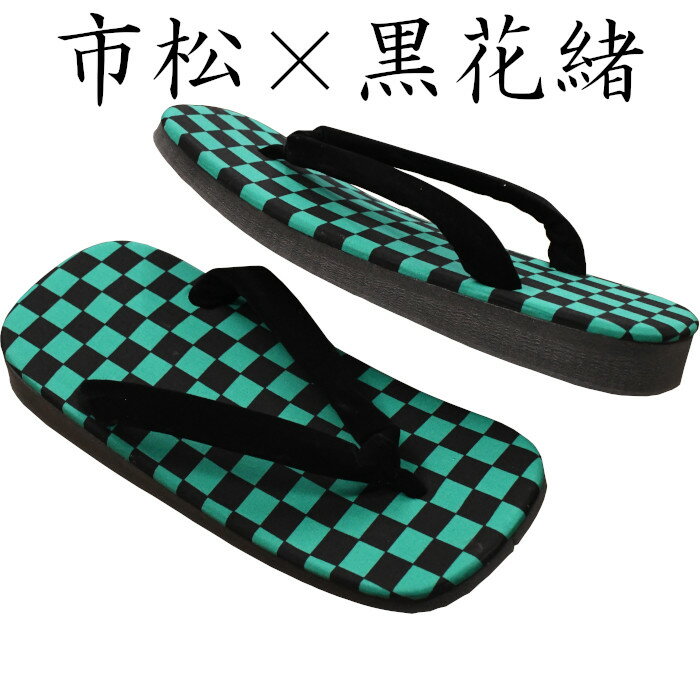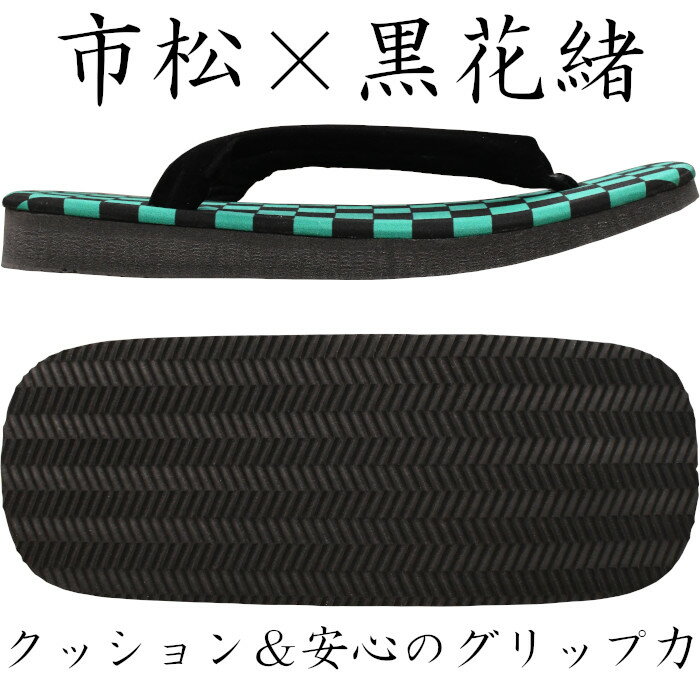 こちらの軽装雪駄は表が緑×黒の市松模様、花緒はシンプルに黒無地花緒を使用。
