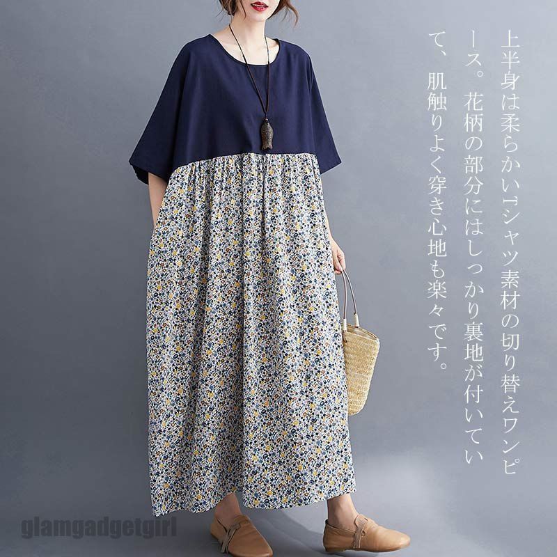 マキシワンピース レディース ワンピース ロングワンピース tシャツワンピース 半袖 夏 花柄 マキシ丈 aライン ロングワンピ 半袖ワンピース 体型カバー ゆったり ロング丈 切替 カジュアル ハイウエスト リラックス 通勤 部屋着 30代 40代 50代 送料無料