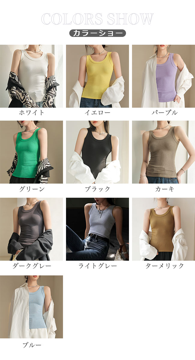 ■トレンドライクなスタイリングに欠かせない一枚 優雅なデコルテの部分を見せて、Uネックタンクトップ 肌に優しくて、吸湿性・通気性・ストレッチ性に優れたリブ生地を採用 落ち着いた色から鮮やかめの色まで、雰囲気異なる豊かなカラバリが用意された 前開きで直用するブラウスや、シアーブラウスのインナーとしても幅広く活躍する ★おすすめポイント★ ●柔らかな肌あたりのレーヨン素材を使用 ●伸縮性があり、どんな体型でも着られる ●無地で、どんなコーデイネートにも似合わう