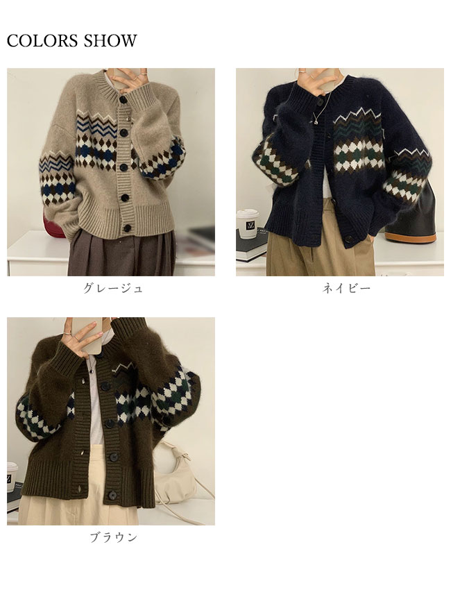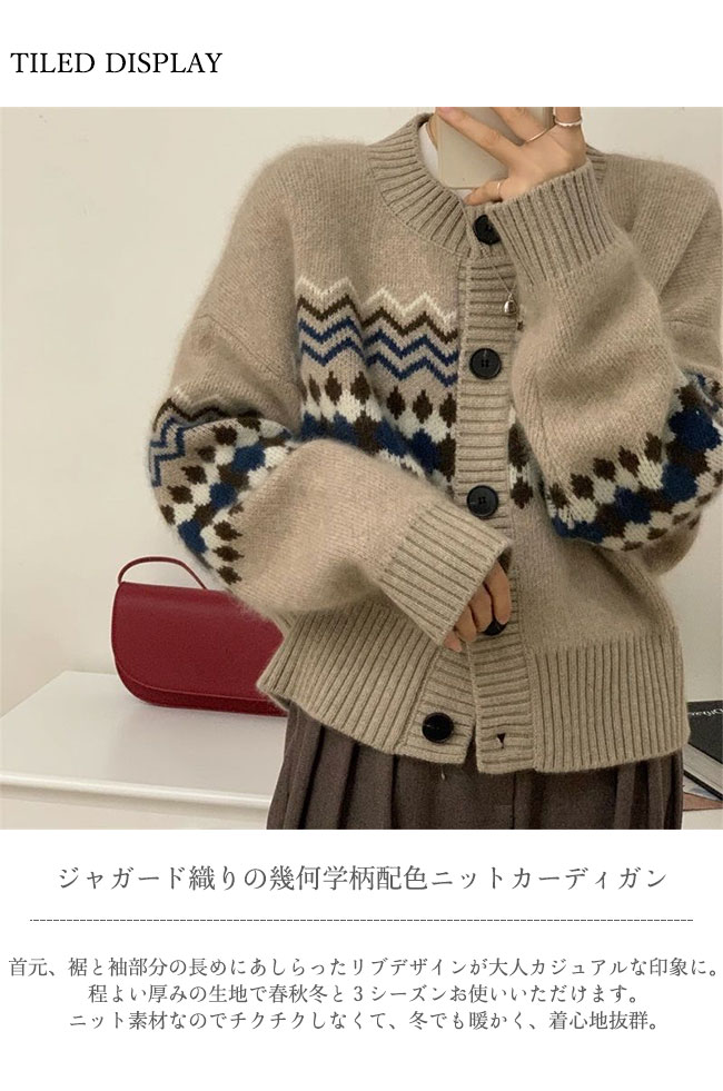 商品詳細 ジャガード織りの幾何学柄配色ニットカーディガンが登場。