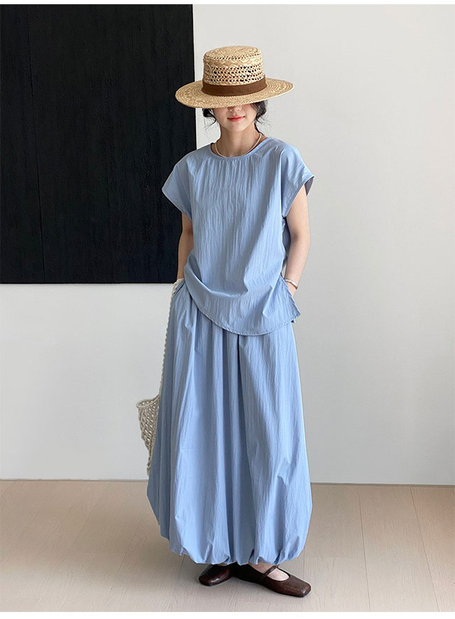 ●トップスはシンプルなラウンドネックに、フレンチスリーブ仕様で二の腕をすっきりカバー。