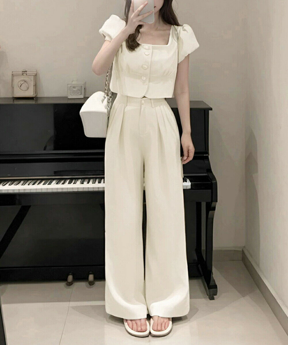 ■商品の特徴レディース パフスリーブトップススクエアネック 着やせ ハイウエストスラックスパンツ おしゃれ韓国風ツーピース大人可愛い半袖のスクエアネックトップスとタック入りのロングパンツがセットになった、おしゃれな上下2点セットアップトップスはパフ袖とクロップド丈のデザインで、女性らしいシルエットを演出ハイウエストデザインとワイドレッグパンツで、穿くだけでスタイルアップして見えるセットアップだから、そのまま着るだけでコーデが完成。