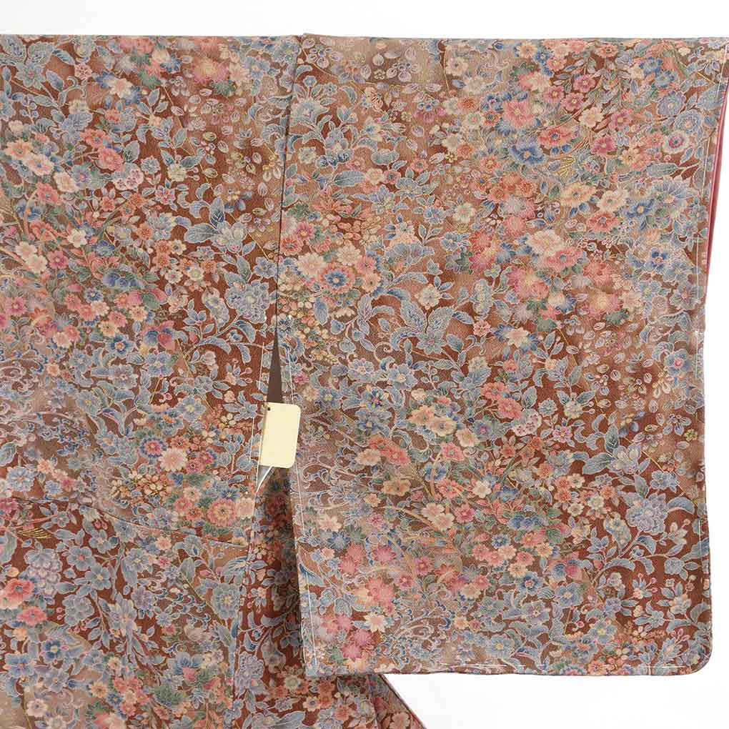 茶色地に花柄の総柄でカジュアル用途にお召しいただけます。