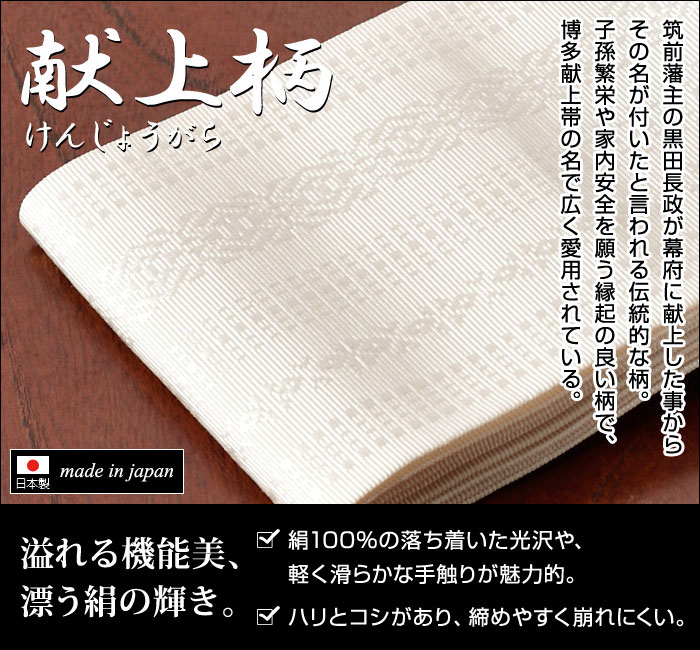 仏具をモチーフとし、子孫繁栄や家内安全を願う縁起の良い柄で、博多献上帯の名で広く愛用されています。