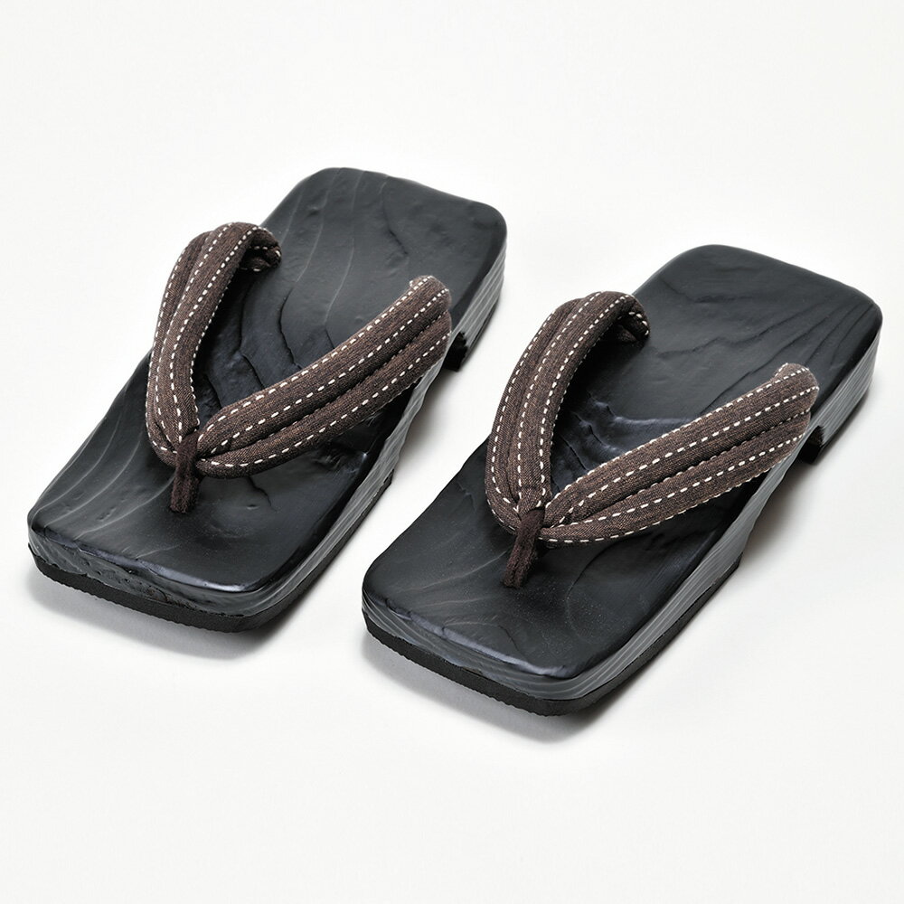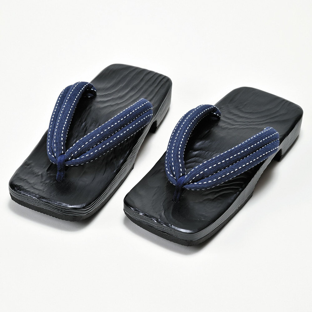 素材 杉 製造 日本製 サイズ L 24.5-26.0 LL 26.0-27.5刺子の意匠がお洒落な鼻緒に、クッション性があり滑りにくいゴム底。 鼻緒に刺し子を採用した、粋でありながら気品あふれる逸品です。 ゴム底で滑りにくく、クッション性があるのが特徴。 “下駄もいいんだけどカタカタと煩くて”という方、ぜひいかがですか。