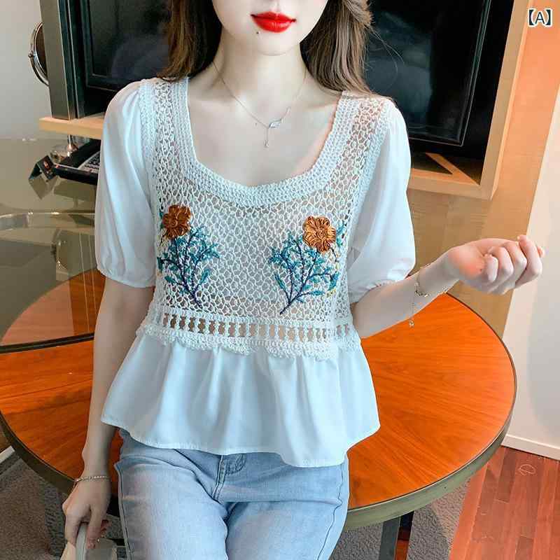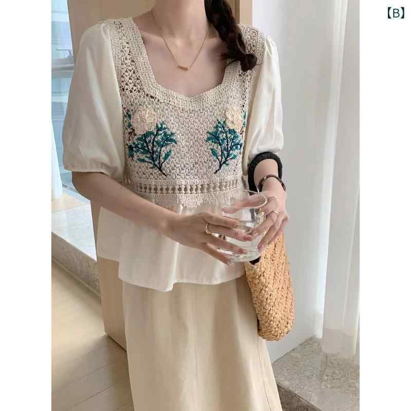 ・カテゴリ: トップス・スタイル: スウィート・主な素材: アクリル90-95%・ネックライン: スクエアネック・袖丈: 五分袖・袖デザイン: ランタンスリーブ・柄: 植物花柄・加工: 刺繍・デザインポイント: かぎ編み・フィット: ゆったり・着用タイプ: プルオーバー・対象: レディース・カラー展開: ホワイト、アプリコット・サイズ展開: フリーサイズ