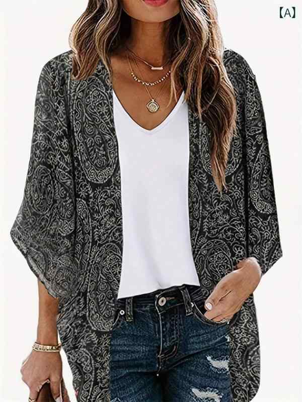 ・カテゴリ: シャツ・スタイル: 日韓カジュアル・主な素材: ポリエステル95%以上・柄: 植物花柄・タイプ: 開襟・袖丈: 七分袖・加工: プリント・シルエット: ゆったり・着丈: ロング丈・ネックライン: ノーカラー・袖のタイプ: レギュラー袖・デザインの特徴: シースルー・前立て: ボタンレス・着心地: 快適・カラー: ブラック・サイズ展開: S、M、L、XL、XXL