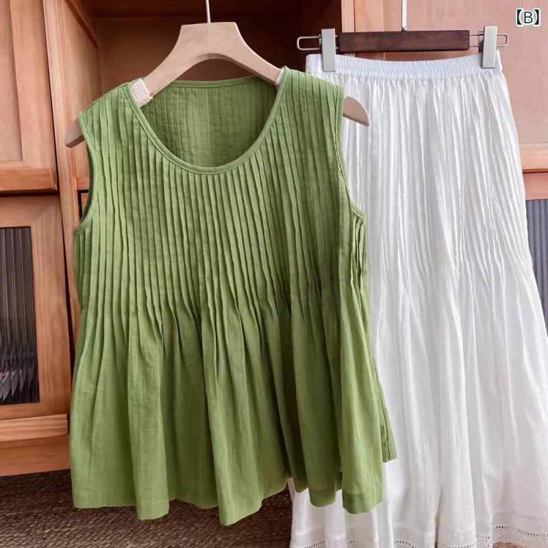・カテゴリ: シャツ・スタイル: 大人カジュアル・主な素材: 綿麻・素材: シェニール・主な素材混率: 30%未満・ネックライン: クルーネック・袖丈: ノースリーブ・柄: 無地・デザイン: ギャザー・フロント: プルオーバー・フィット: ルーズフィット・着丈: ミドル丈(約50cm-65cm)・カラー展開: 白、緑・サイズ展開: M、L、XL、XXL