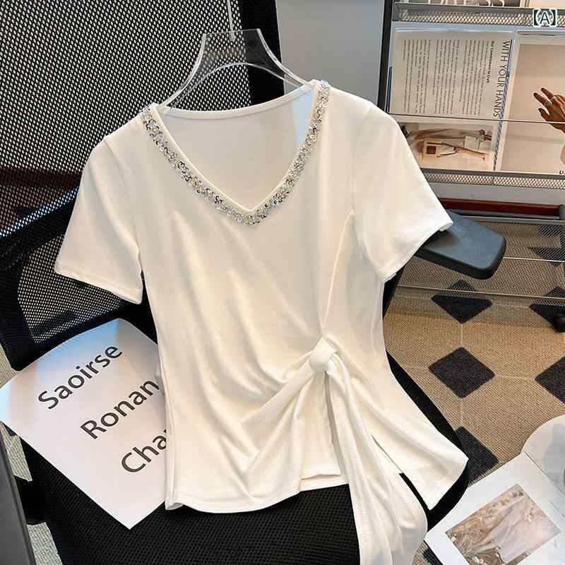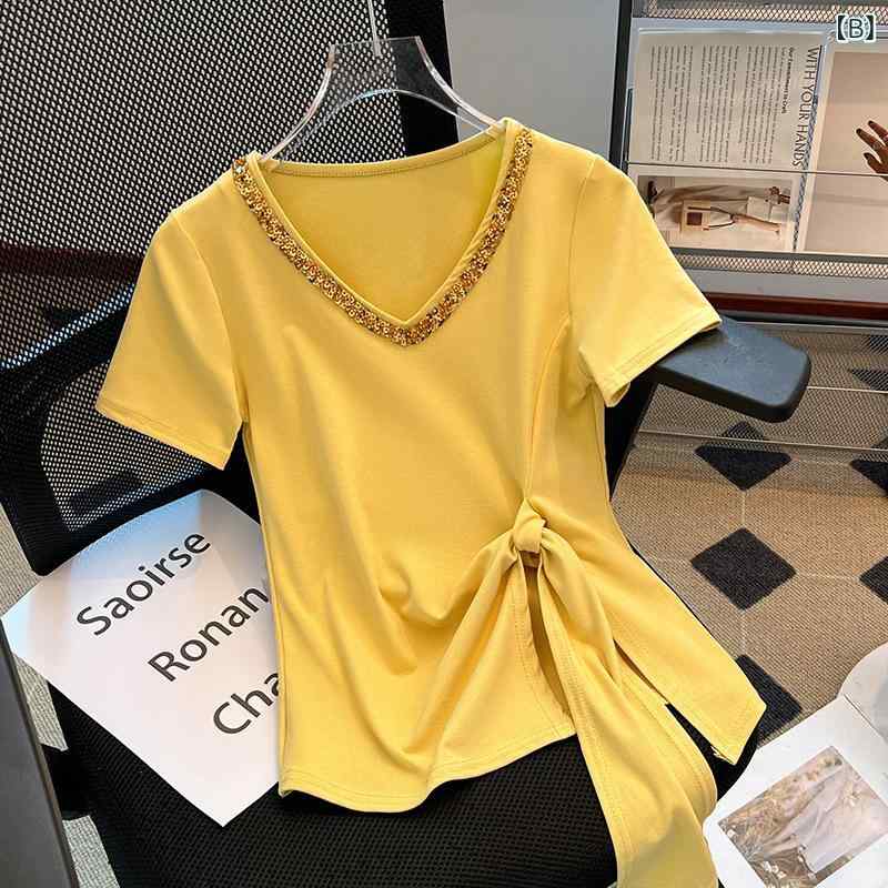 ・主な素材: アクリル95%以上・装飾: ラインストーン・カラー展開: ホワイト、イエロー、ブルー・サイズ展開: S、M, L, XL・スタイル: ストリート系・ネックライン: Vネック・フィット: スリム・袖丈: 半袖・性別: 女性