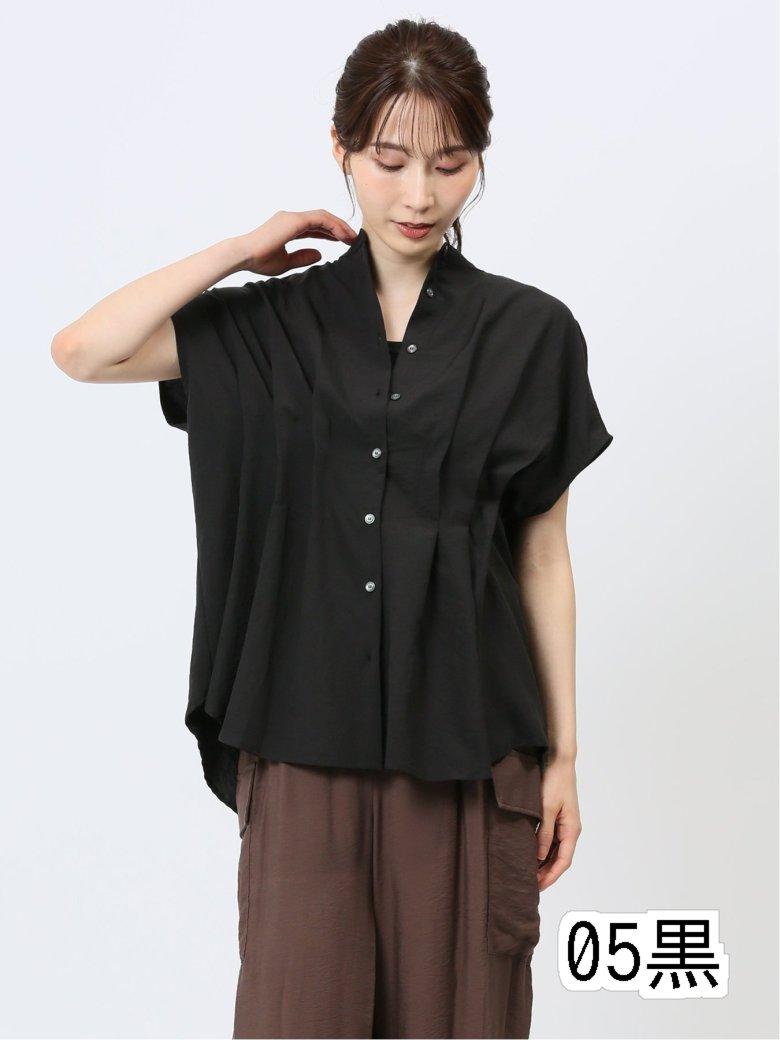 ほんのりとした透け感、ウエストのタック、上品なバンドカラーがポイント。