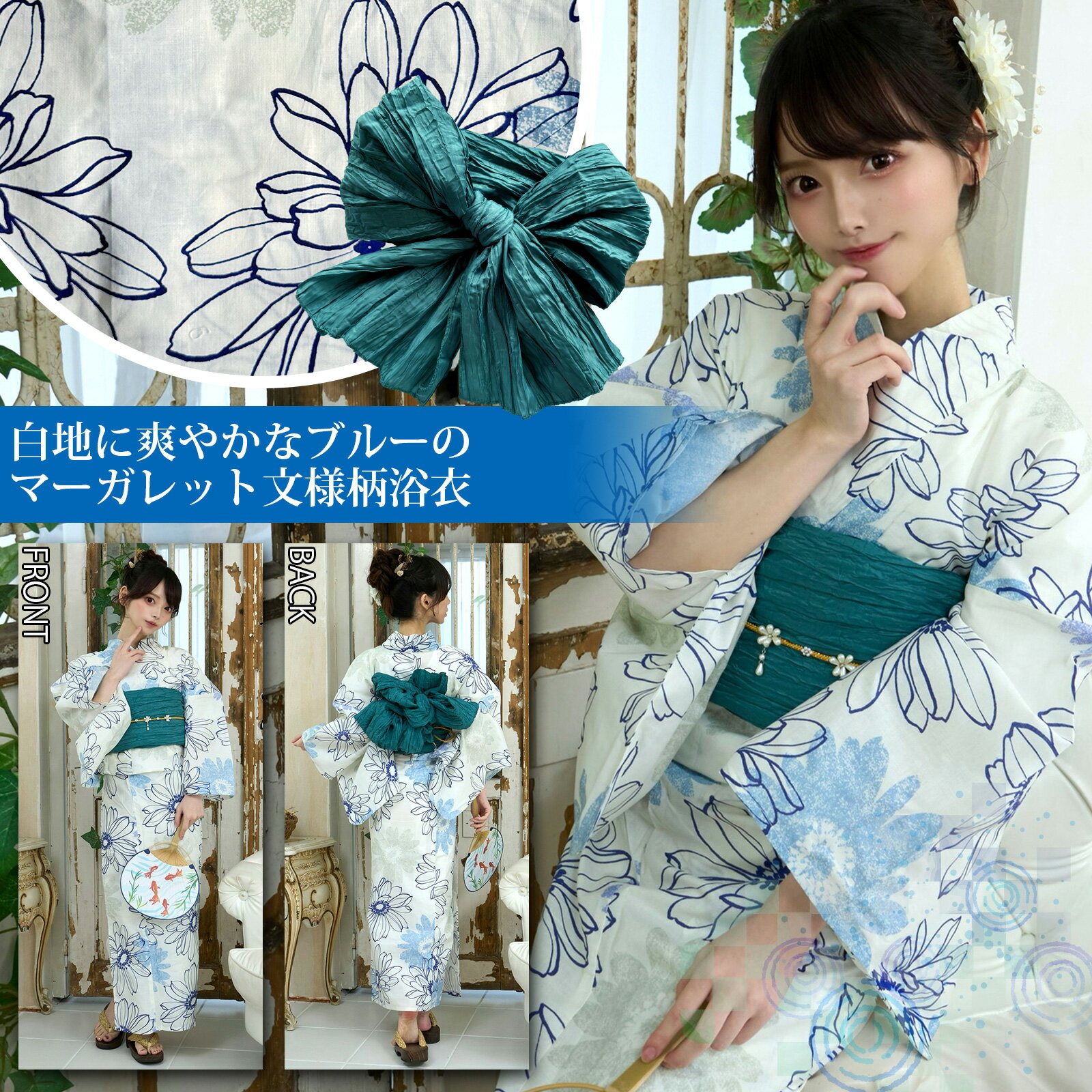 ■白地に爽やかなブルーのマーガレット文様柄浴衣3点セット(YUKATA)。