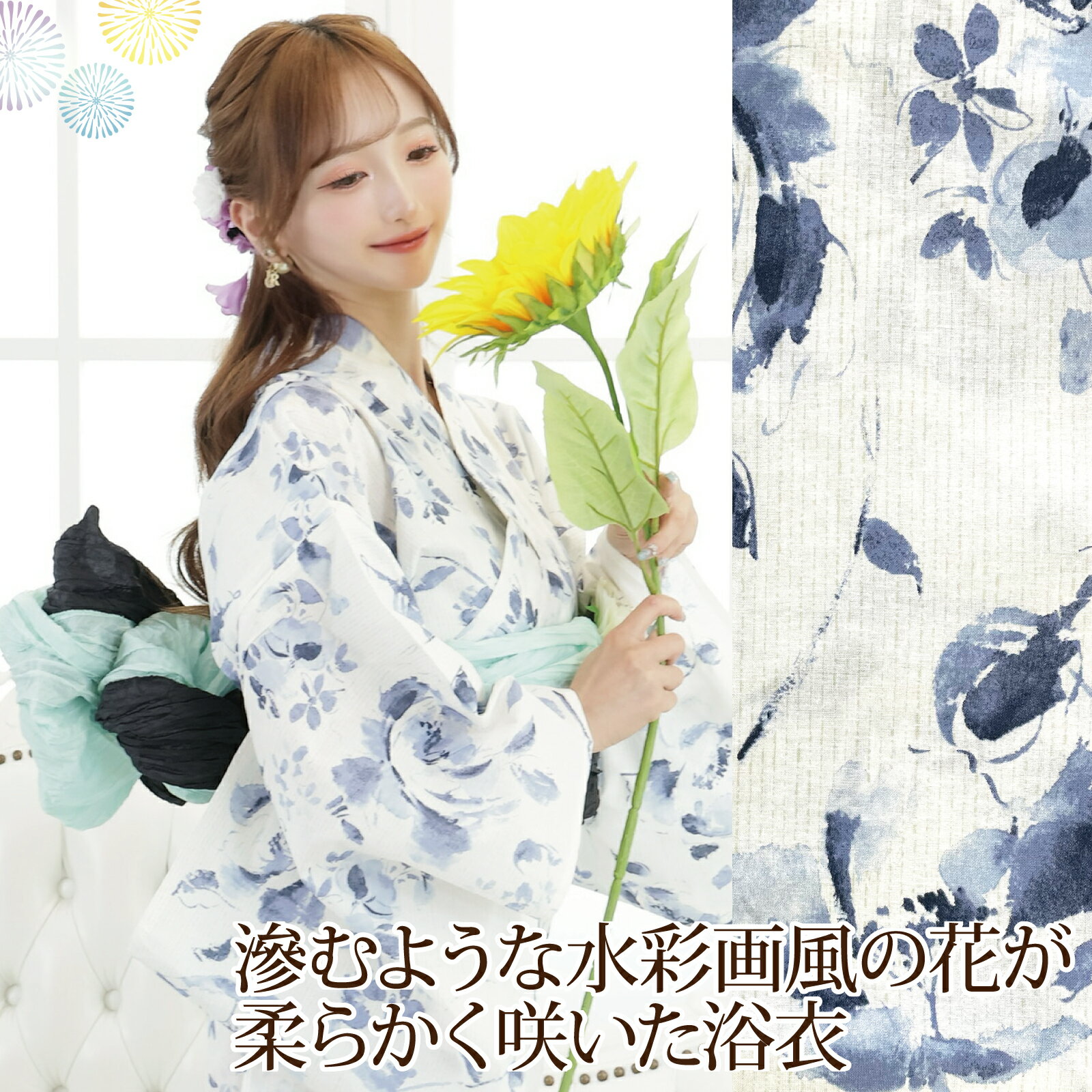 ■滲むような水彩画風の花が柔らかく咲いた浴衣3点セット(YUKATA)。
