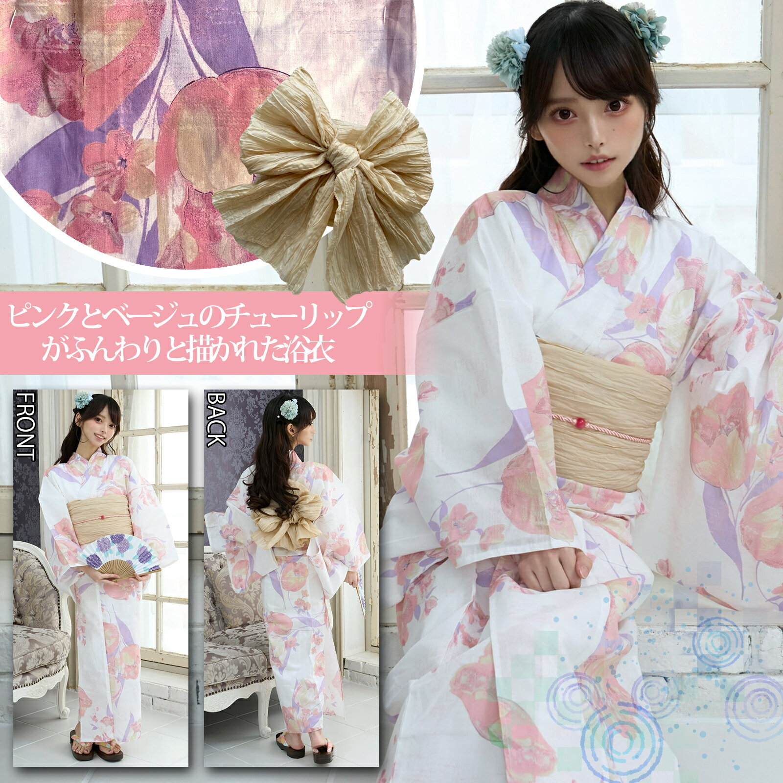 ■薄ピンク地に淡いピンクとベージュのチューリップがふんわりと描かれた浴衣3点セット(YUKATA)。