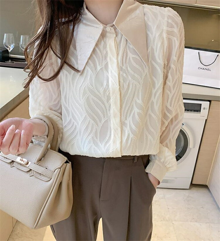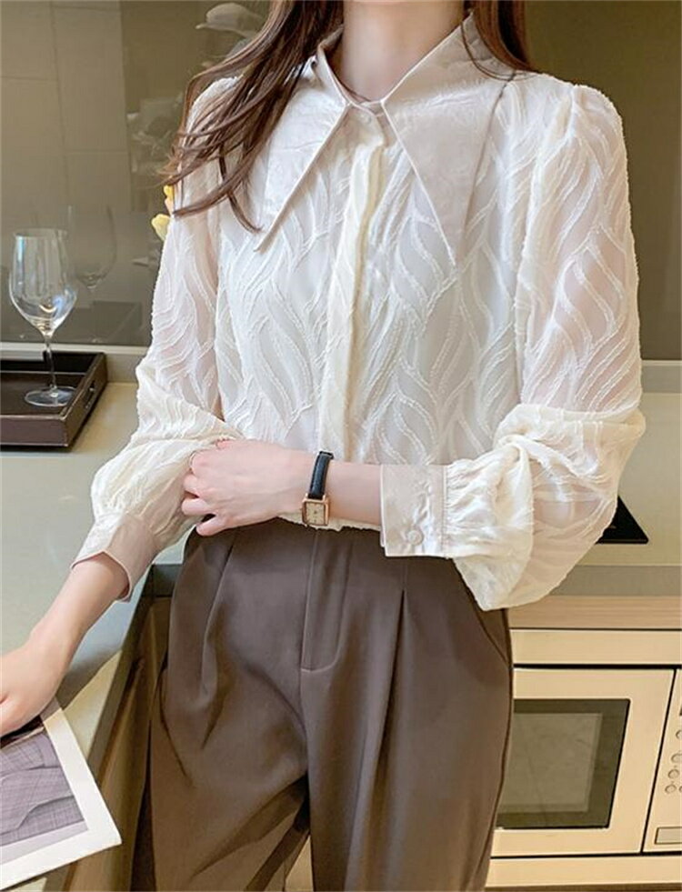 この清純で魅力的な長袖シフォンブラウスは、先のとがった襟が特徴です。
