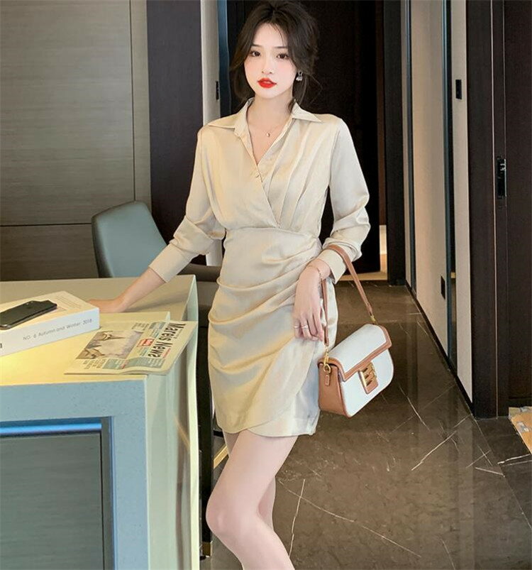 女の子ファッション 光沢のあるスリム Vネック シャツ ワンピース 夏