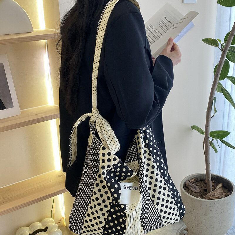 春夏にぴったりのかわいいショルダーバッグです。韓国ファッションのトレンドを取り入れたドット柄が特徴で、エコバッグとしても活躍します。軽量で持ち運びやすく、デイリーユースに最適です。