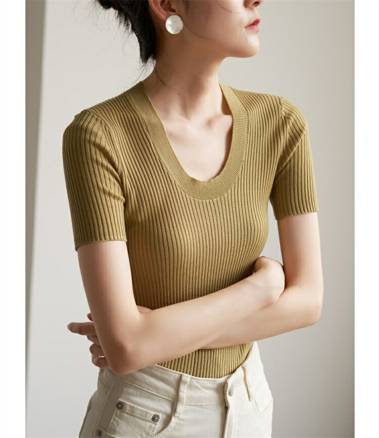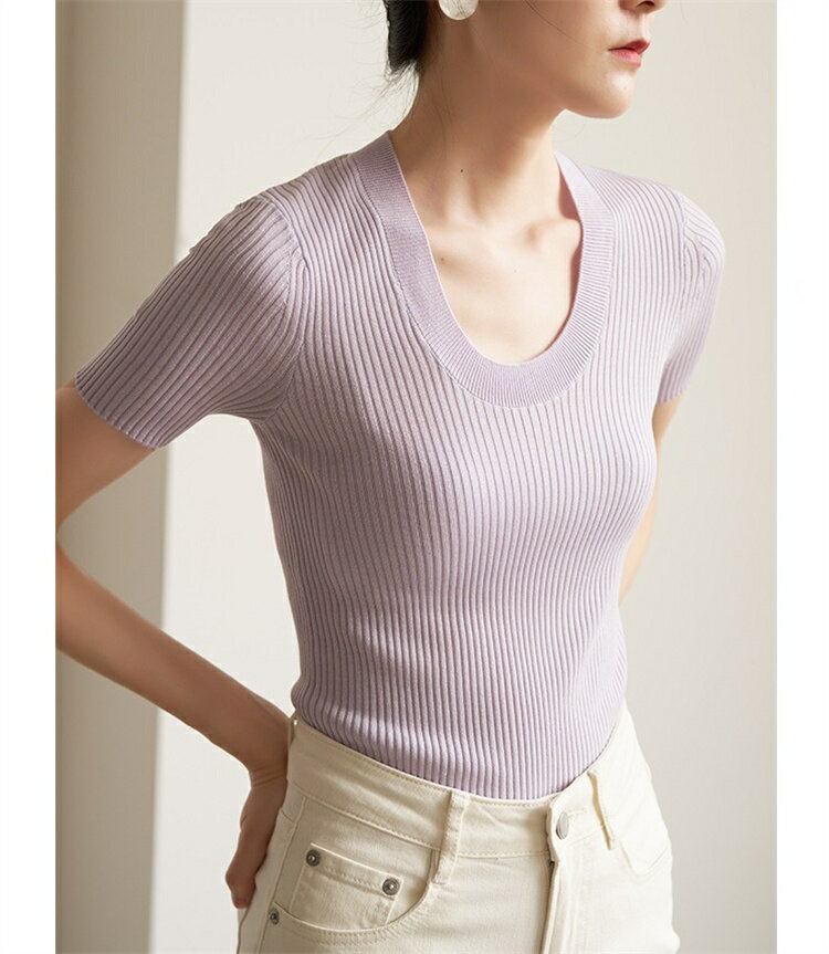 シンプルで涼しげなUネックの半袖ニットトップスです。どんなスタイルにも合わせやすく、カジュアルからオフィススタイルまで幅広く活躍します。柔らかな素材感で着心地も抜群。カラーはべージュ、ブラック、イエロー、パープル、ブルーの5色展開。あなたのお気に入りの一着を見つけてください。