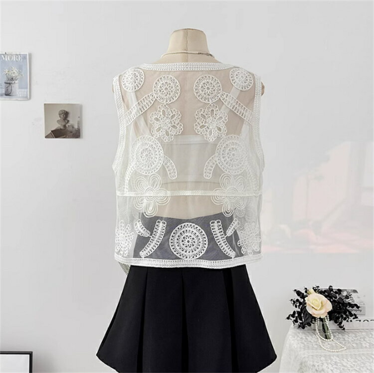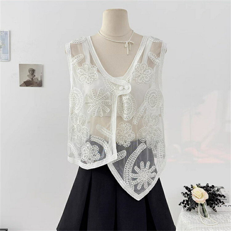 超薄手のネット素材と繊細なビーズ使いで、涼しげな印象を与えるビーズアクセントのメッシュデザインベストです。