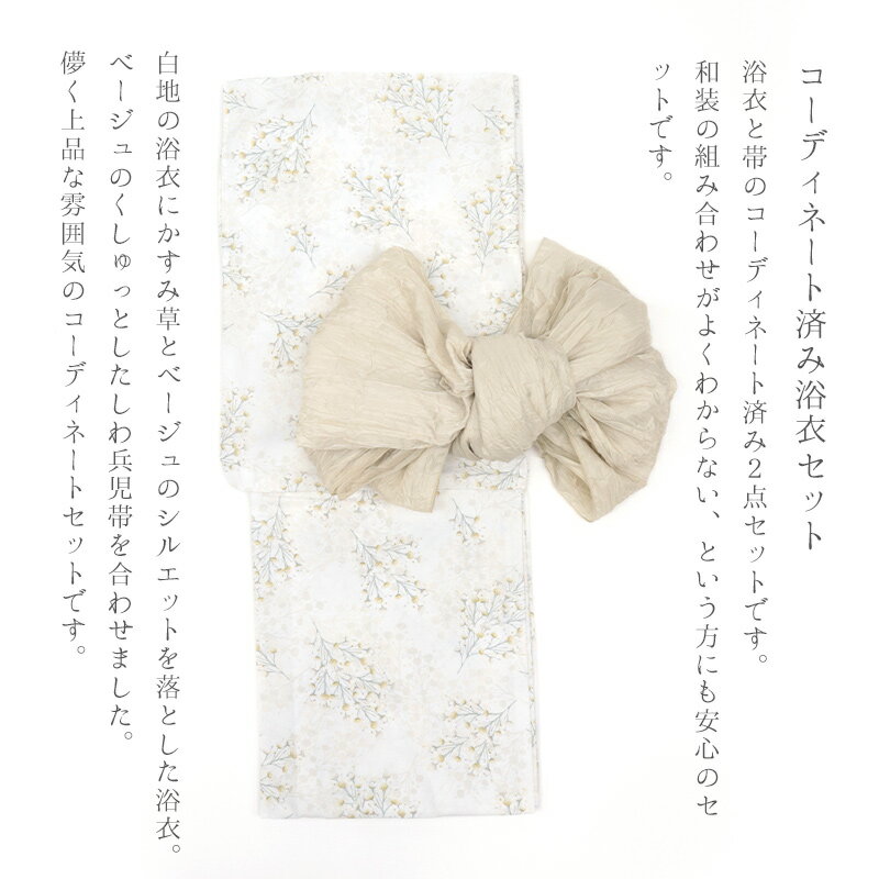 コーディネート済み浴衣セット 白地の浴衣にかすみ草とベージュのシルエットを落とした浴衣。