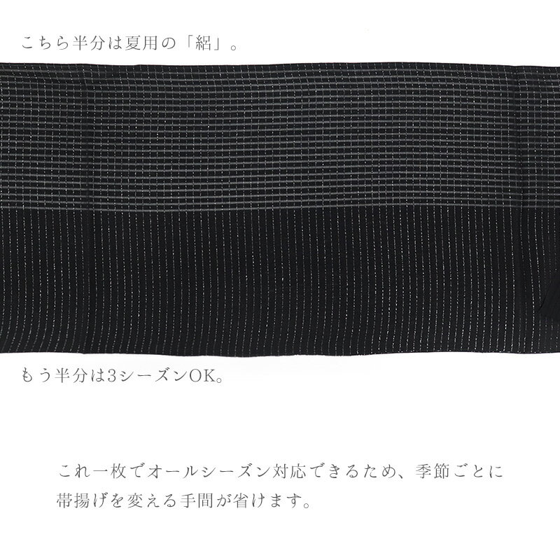 季節を問わず使える便利なデザイン 片側は通気性に優れた夏向けの絽目生地、もう片側はふんわりとした風合いで春・秋・冬に使える生地で仕上げました。