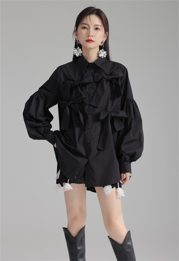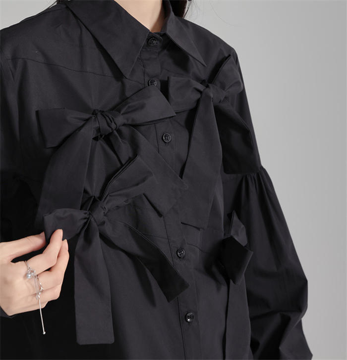 素材 綿 生産国 中国 キーワード シャツ レディース チュニック 春 秋 ロングシャツ リボン 蝶結び レイヤード シャツ ロング丈 モード デザイン お洒落 トップス 長袖 無地 前開き ボタン 体型カバー 大きいサイズ 重ね着 通勤 オフィス ビジネス 着回し ファッション 送料無料 黒 白 ブラック ホワイト
