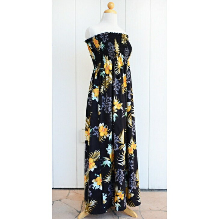 【 ファーンハイビスカス】 ブラック メンズアロハシャツとお揃いができる、人気マキシ丈ロングチュニックドレスです。