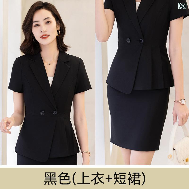 ・カテゴリ: レディーススーツ・スタイル: OL通勤、エレガント・主な素材: ポリエステル50~70%未満、レーヨン30%以下・カラー展開: ブラック、ネイビー、グレー・サイズ展開: S、M、L、XL、XXL、3XL、4XL・スカート丈: ショート丈・袖タイプ: レギュラー袖・袖丈: 七分袖