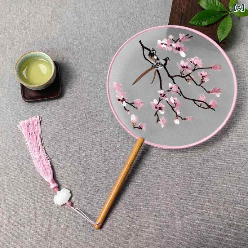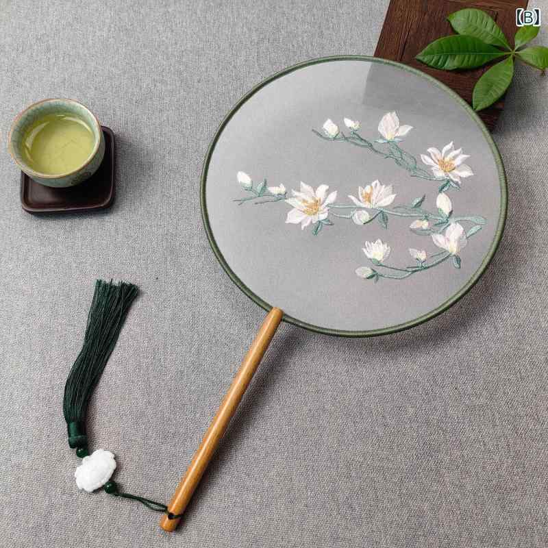 ・カテゴリ: 団扇・主な素材: 絹・サイズ: 扇面直径約21cm、手持ち部分約15cm・工芸: 刺繡・骨組み素材: 鋼・スタイル: 中国風・柄展開: 喜鵲と梅、クチナシ、満開の花々、鳥と花の香り、スイカズラ、蘭、ザクロ、喜鵲と梅の戯れ、白蓮、紫のクジャクサボテン、花の香り、トンボと蓮、仙鶴と梅、スズラン、蓮、妖姫、蓮の仙女、君子蘭、金色の木蓮、ピンクの木蓮、白い木蓮、バラ、蓮の香り、大輪の蓮、清新な趣、彼岸花