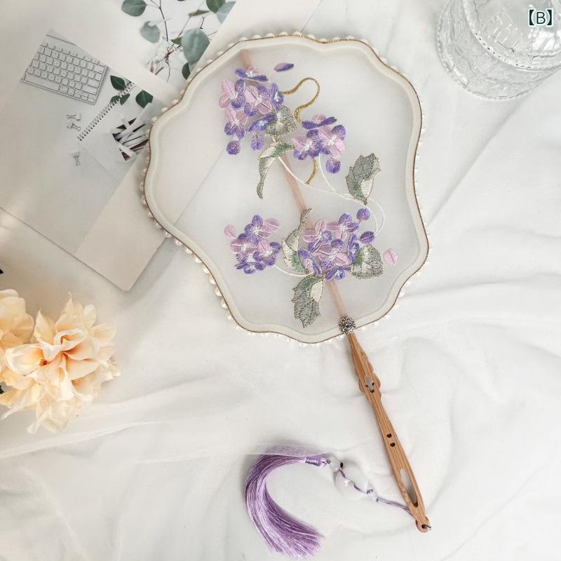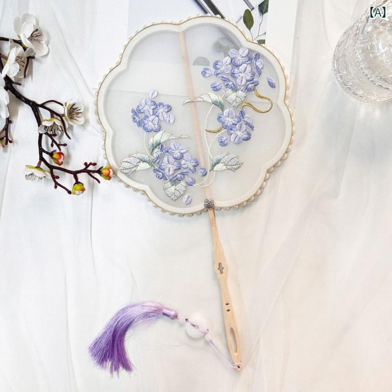 ・カテゴリ: 古風扇・スタイル: 中華風・素材: 竹・加工: 刺繡・骨組み素材: 竹・カラー展開: 八瓣紫鶯花, 鳳冠紫鶯花, 円形紫鶯花, 円形紫鶯花(パール縁なし), 円形藍夢玲蝶, 鳳冠藍夢玲蝶, 八瓣藍夢玲蝶