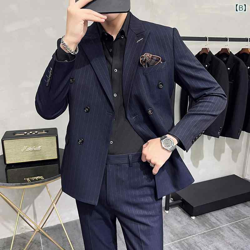 ・カテゴリ: メンズスーツ ・スタイル: ライトビジネス ・テイスト: ファッション都市 ・素材: 化学繊維混紡(アセテート繊維67.2%) ・生地の厚さ: 通常 ・シルエット: スリムフィット ・襟型: ピークドラペル ・ベント: センターベント ・フロント: ダブルブレスト2つボタン ・デザイン: 金属装飾 ・着用シーン: カジュアル ・カラー展開: ブラック、高級ブルー、ブラウン、ミストグレー ・サイズ展開: S、M、L、XL、2XL、3XL、4XL、5XL、6XL、7XL