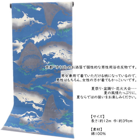 商品説明 京都「ゆうび」のお洒落な男性用浴衣反物です。 ゆかたとしてはもちろん、夏着物としても着て頂けます。 こちらの反物はキングサイズなので、男女どちらにもお仕立て可能です。 ■お仕立てご希望の方はお知らせ下さい。 →浴衣ミシン仕立てはこちら →浴衣手縫い仕立てはこちら →浴衣水通しはこちら
