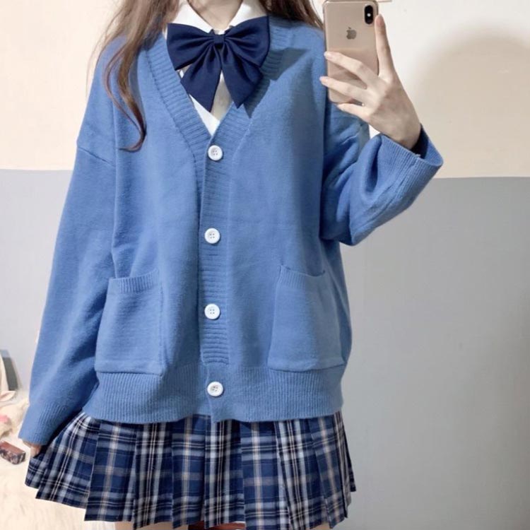 首元を綺麗に見せるVネックがブラウスや制服とも相性抜群!左右にポケットのついた着まわし抜群の必須アイテム。