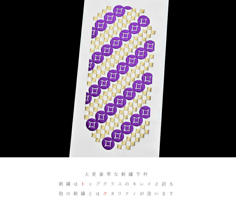 半衿 半襟 振袖 成人式 豪華刺繍 白地 紫 市松 七宝 金糸 シルエリー Silelly おしゃれ半衿 刺繍半衿 お洒落着用 レトロ アンティーク モダン 高級 成人式 結婚式 前撮り 卒業式 謝恩会 入学式 卒園式 入園式 七五三 お宮参り お茶会 パーティー 観劇 かわいい ポリエステル 日本製 No.10-0607 サイズ表 cm サイズ 長さ:約110cm 幅:約16.0cm 商品詳細