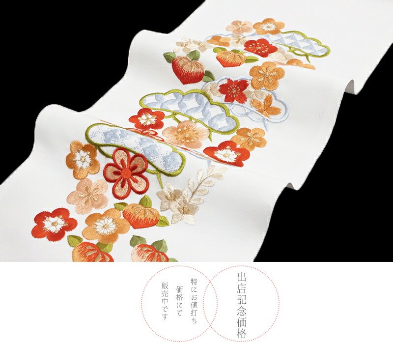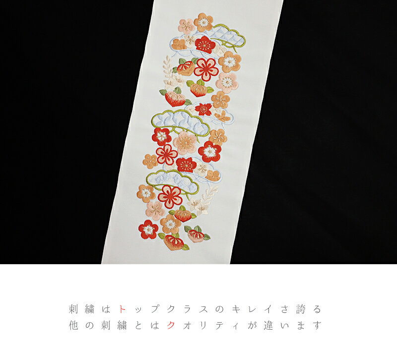 すべらかな生地の上に白地に 赤糸 オレンジの糸で豪華に松竹梅があらわされました。