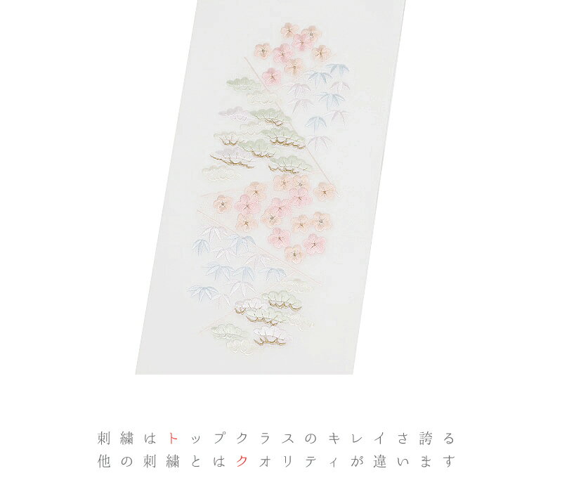 半衿 半襟 振袖 成人式 豪華刺繍 松竹梅 白地 淡い桃色糸 淡い緑色糸 シルエリー Silelly おしゃれ半衿 刺繍半衿 お洒落着用 レトロ アンティーク モダン 高級 成人式 結婚式 前撮り 卒業式 謝恩会 入学式 卒園式 入園式 七五三 お宮参り お茶会 パーティー 観劇 かわいい ポリエステル 日本製 メール便OK No.10-4741 サイズ表 cm サイズ 長さ:約110cm 幅:約16.0cm 商品詳細