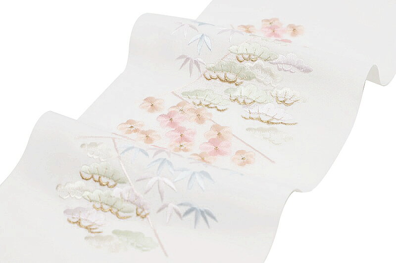 すべらかな生地の上に淡い桃色糸、淡い緑色糸で豪華に松竹梅があらわされました。