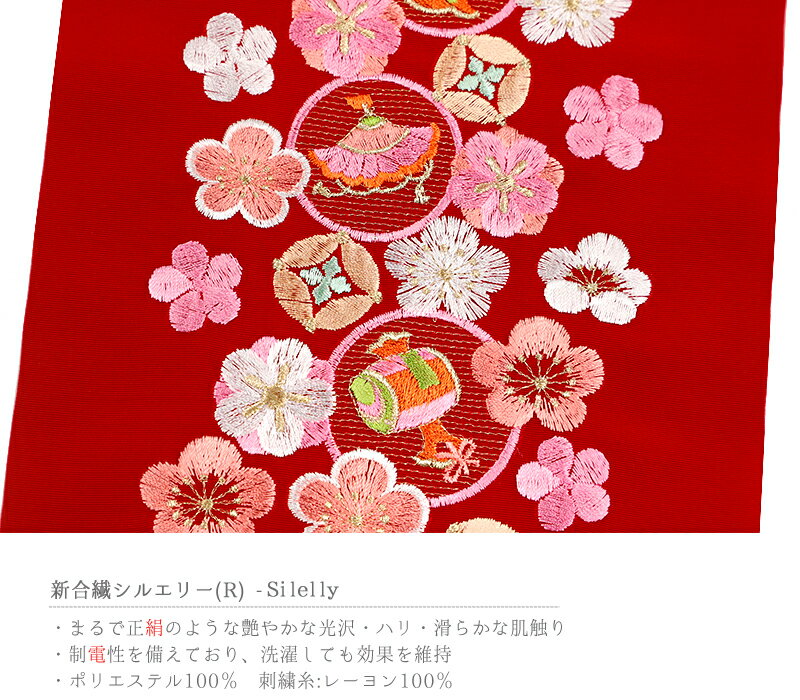 シルエリーの特長 ○正絹風のつややかな光沢と滑らかな肌触り ○ハリ・コシに大変優れています ○制電性を備えており、洗濯しても効果を維持します 滑らかな肌触りの上品な赤色地に、華やかなピンク色やサーモンピンク色、白色などの色糸で 梅の花に宝尽くしの豪華な古典模様があらわされました。