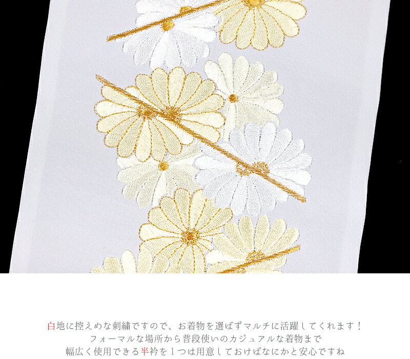 半衿 半襟 振袖 成人式 豪華刺繍 白地 イエローベージュ クリーム色 薄黄色 白 金 金糸 オフホワイト パステルカラー 菊 花 和柄 京和彩 おしゃれ浪漫 おしゃれ半衿 刺繍半衿 フォーマル 礼装 お洒落 レトロ アンティーク 高級 成人式 結婚式 前撮り 卒業式 謝恩会 入学式 卒園式 入園式 七五三 お宮参り お茶会 パーティー 観劇 かわいい ポリエステル 日本製 No.10-5005 サイズ表 サイズ 長さ:約115.0cm 幅:約16.5cm 商品詳細