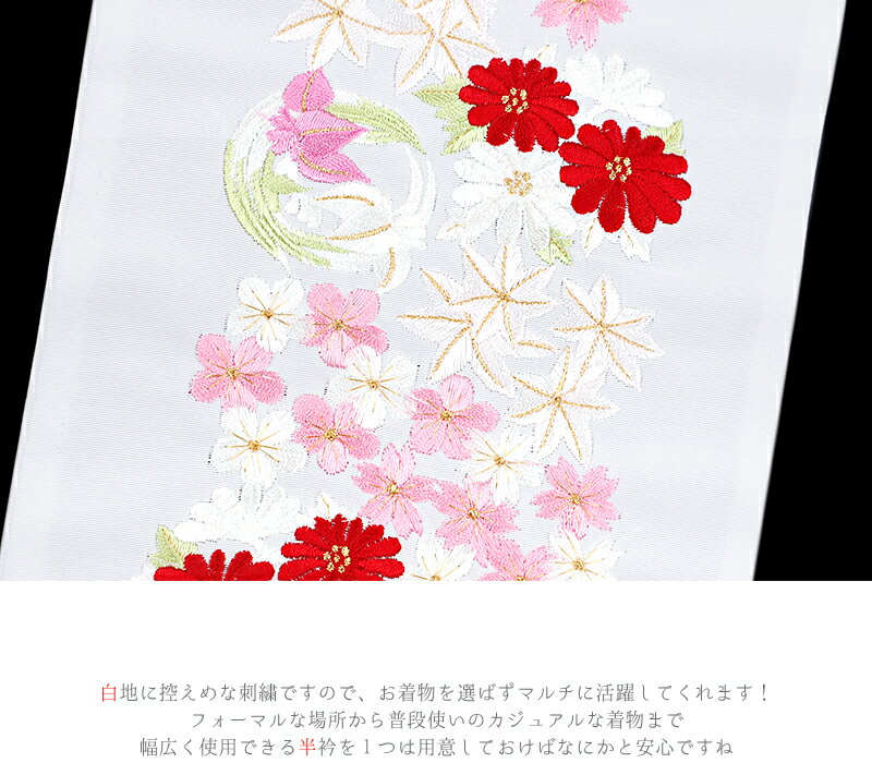 つややかで滑らかな手触りのすっきりと上品な白地に、上品な赤色やピンク色、淡い薄ピンク色などのやわらかな色合いで 豪華な花々の刺繍が施されております。