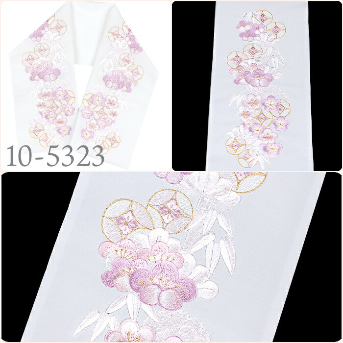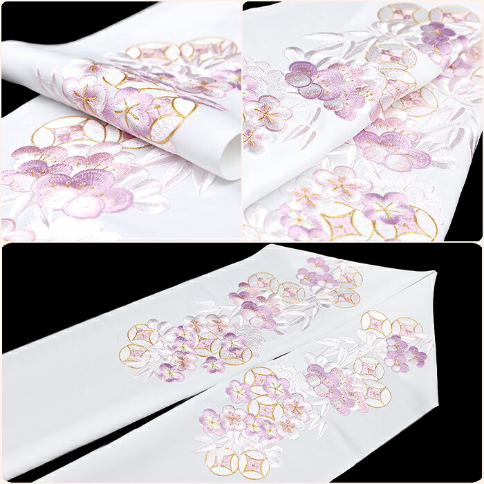 つややかで滑らかな手触りのすっきりと上品な白地に、淡く綺麗な薄紫色や輝きのある金糸で 豪華な松竹梅の刺繍が施されております。