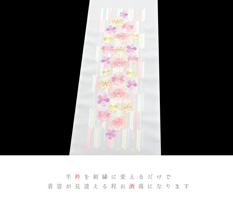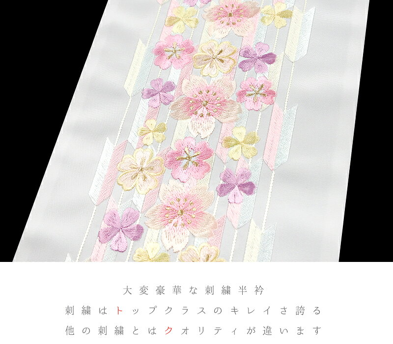 半衿 半襟 振袖 成人式 豪華刺繍 白地 オフホワイト ピンク 水色 紫 黄色 金 花 桜 矢羽根 和柄 シルエリー Silelly おしゃれ半衿 刺繍半衿 お洒落着用 レトロ アンティーク モダン 高級 成人式 結婚式 前撮り 卒業式 謝恩会 入学式 卒園式 入園式 七五三 お宮参り お茶会 パーティー 観劇 かわいい ポリエステル 日本製 No.10.10-5493 サイズ表 サイズ 長さ:約110cm 幅:約16.0cm 商品詳細