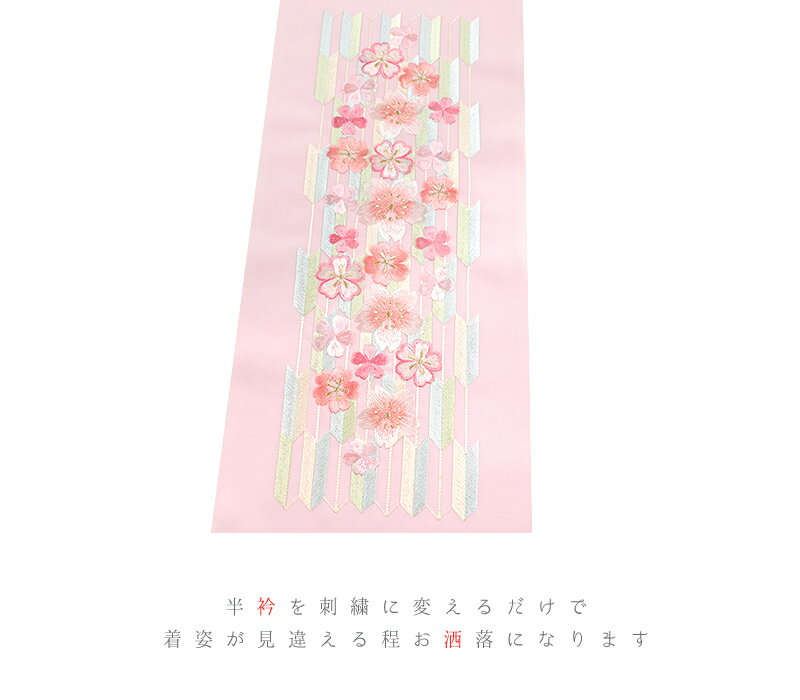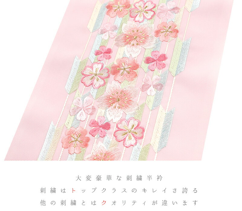 半衿 半襟 振袖 成人式 豪華刺繍 ピンク サーモンピンク 水色 黄色 金 花 桜 矢羽根 和柄 シルエリー Silelly おしゃれ半衿 刺繍半衿 お洒落着用 レトロ アンティーク モダン 高級 成人式 結婚式 前撮り 卒業式 謝恩会 入学式 卒園式 入園式 七五三 お宮参り お茶会 パーティー 観劇 かわいい ポリエステル 日本製 No.10.10-5499 サイズ表 サイズ 長さ:約110cm 幅:約16.0cm 商品詳細