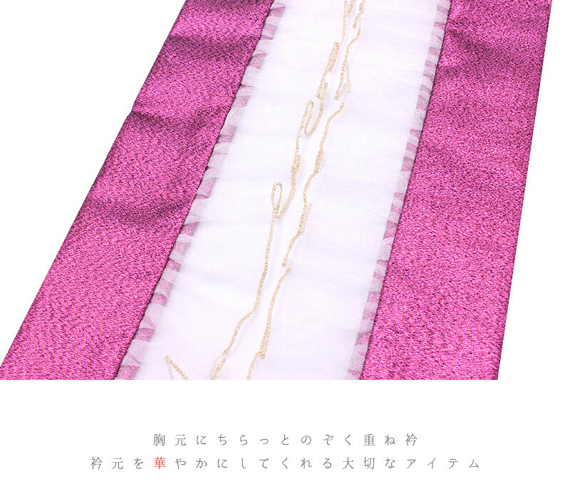 お着物の色柄、帯や髪飾り、帯揚げの色に合わせて統一感を出して上品に大人っぽくしたり、 あえて反対色を選んで差し色にして個性的なコーディネートにしたり・・・ 合わせ方はあなた次第で着姿の雰囲気も自在に♪ 重ね衿ピンが3本付属しますので、縫わずに素早くお使いいただけます。