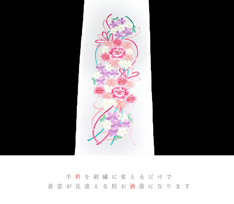 ■おすすめポイント お洒落は小物から・・・ 高級感あふれる、ふっくらと美しい刺繍が魅力的な 正絹風のなめらかな肌触りと上品な光沢を持ち合わせたポリエステル素材の いくつもコレクションしたくなる、お洒落半衿です。